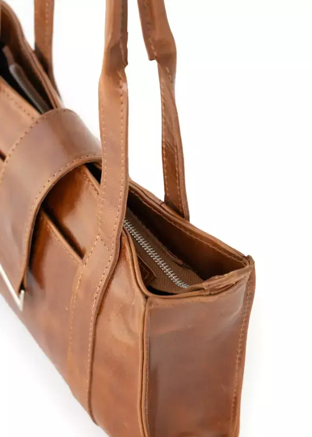 Cartera rectangular tipo baguette, confeccionada en 100% cuero vacuno. Tiene doble manija. Posee un bolsillo con cierre en su interior y un bolsillo sin cierre en su exterior. Está forrada por dentro. La cartera cierra con cierre metálico y con una solapa de cuero con broche imantado y posee un herraje en níquel decorativo (doble seguridad).